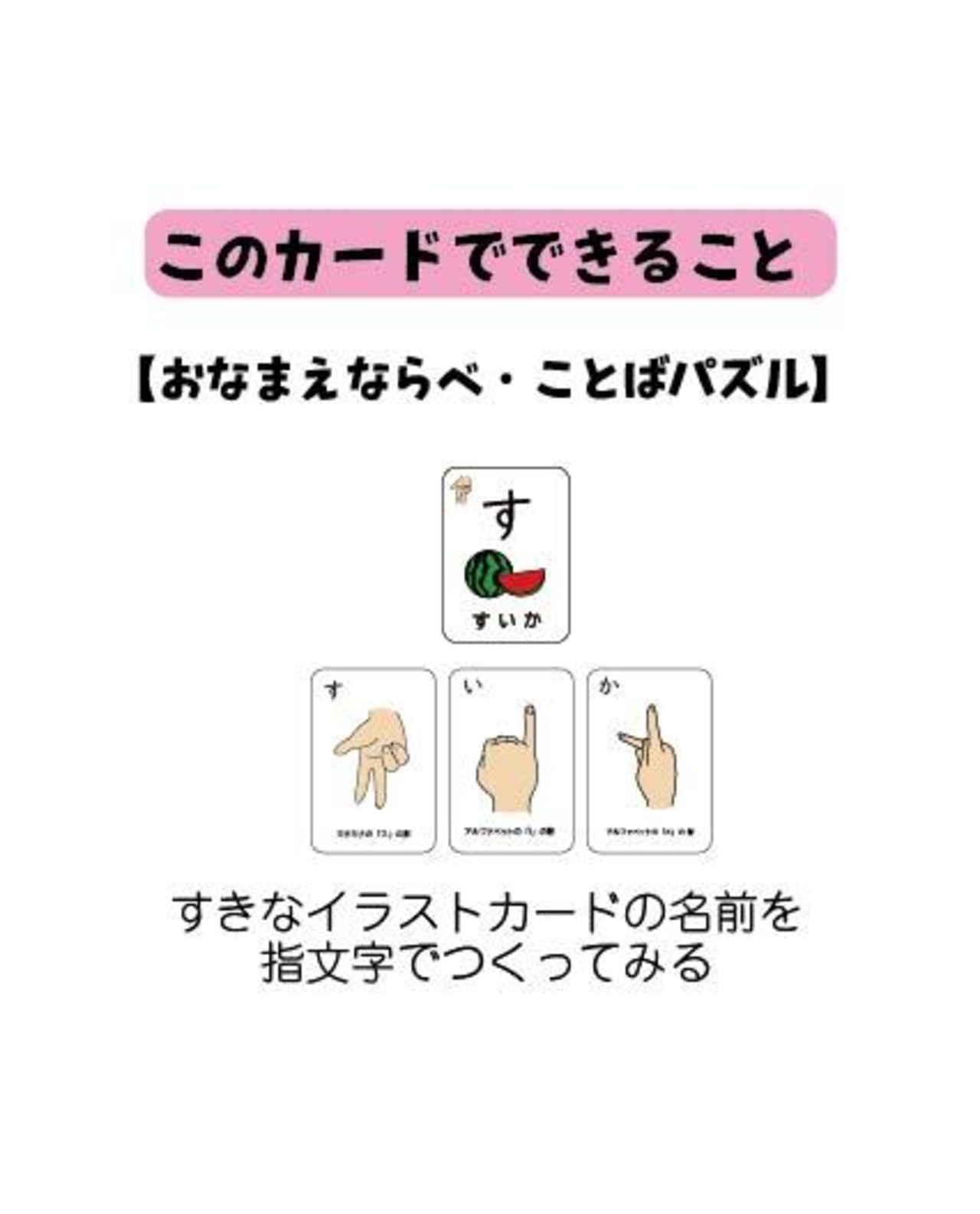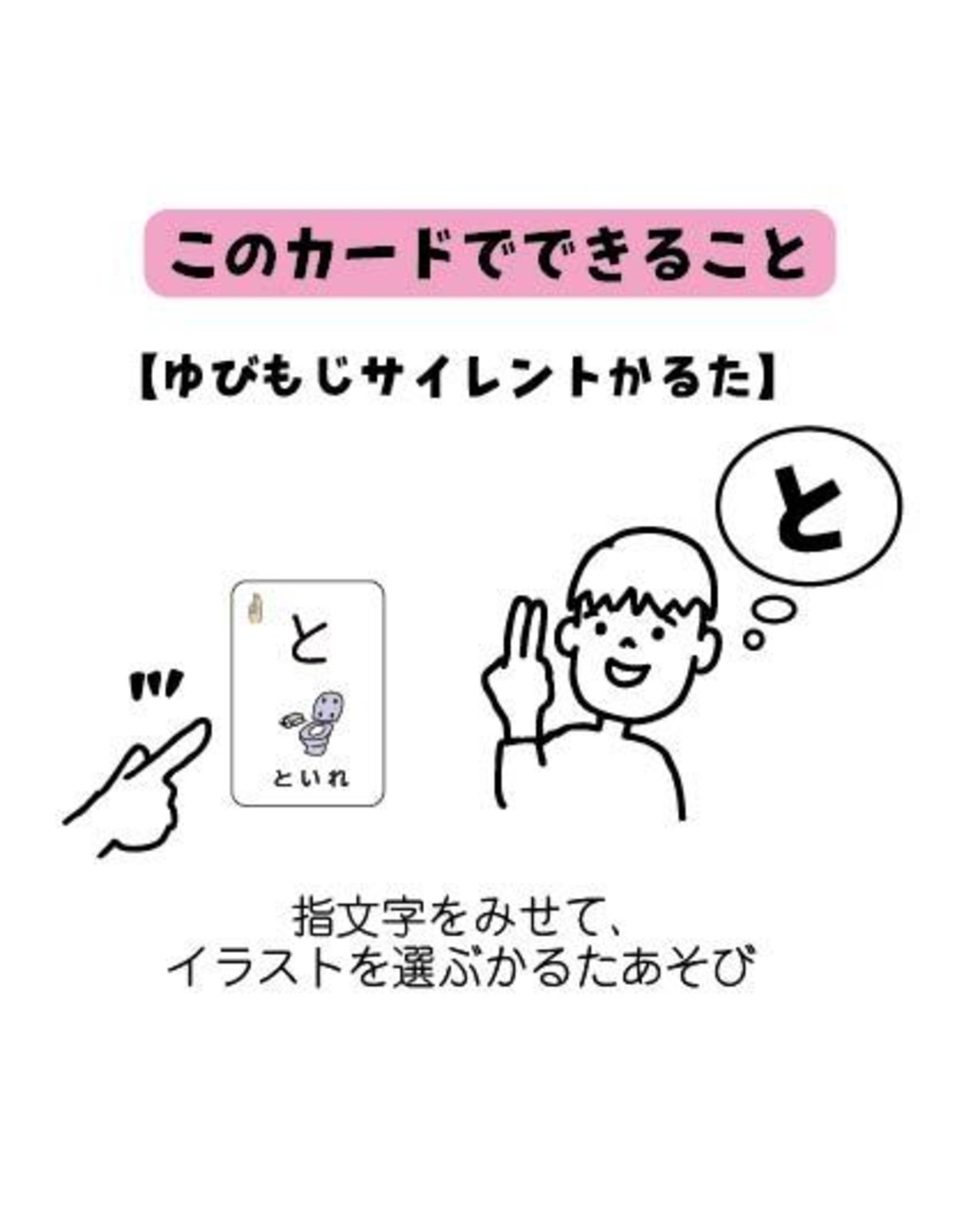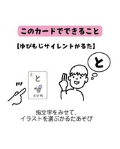 このカードは、手話の一部である「指文字(ゆびもじ)」と、その音から始まる「イラスト」をペアにして遊べる、新感覚のことばあそびカードです。