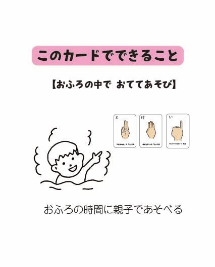 本カードは耐水性に優れているため、お風呂の壁に貼って遊ぶことも可能です。リラックスできる親子の時間に、好きな言葉を壁に並べて、ゆったりとおててあそびを楽しんでください。
