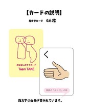 ●指文字カード(46枚):五十音の「指の形」を、お子様にも親しみやすい柔らかなタッチで描いています。