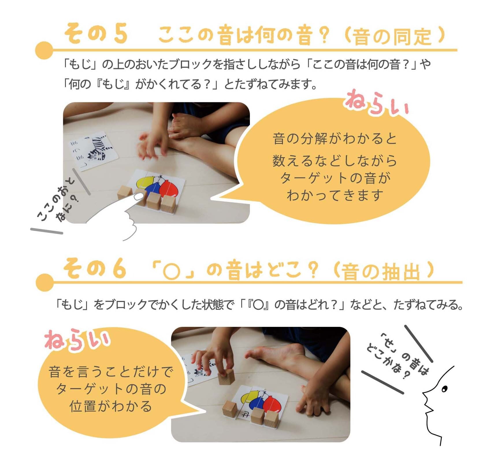 ・文字を意識しはじめるころにブロックを文字の上におきながら数えたり、かくして文字を当てたりしてあそべます。(4歳頃~)